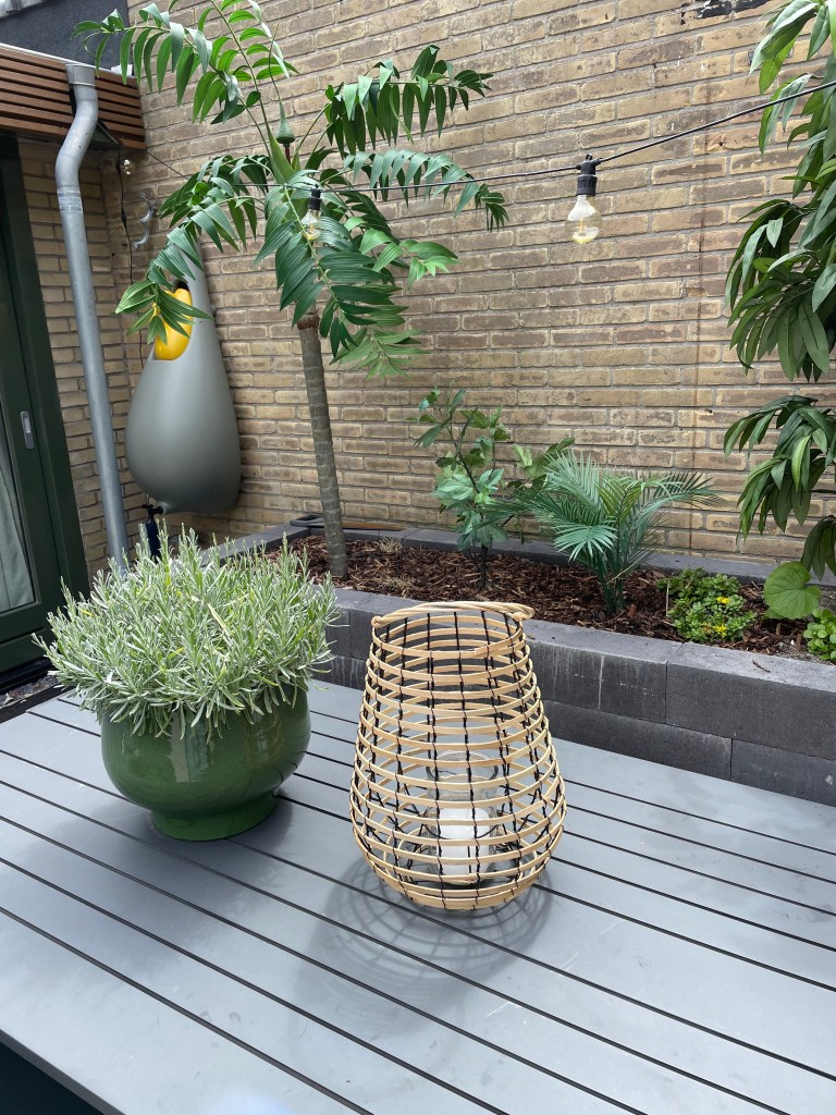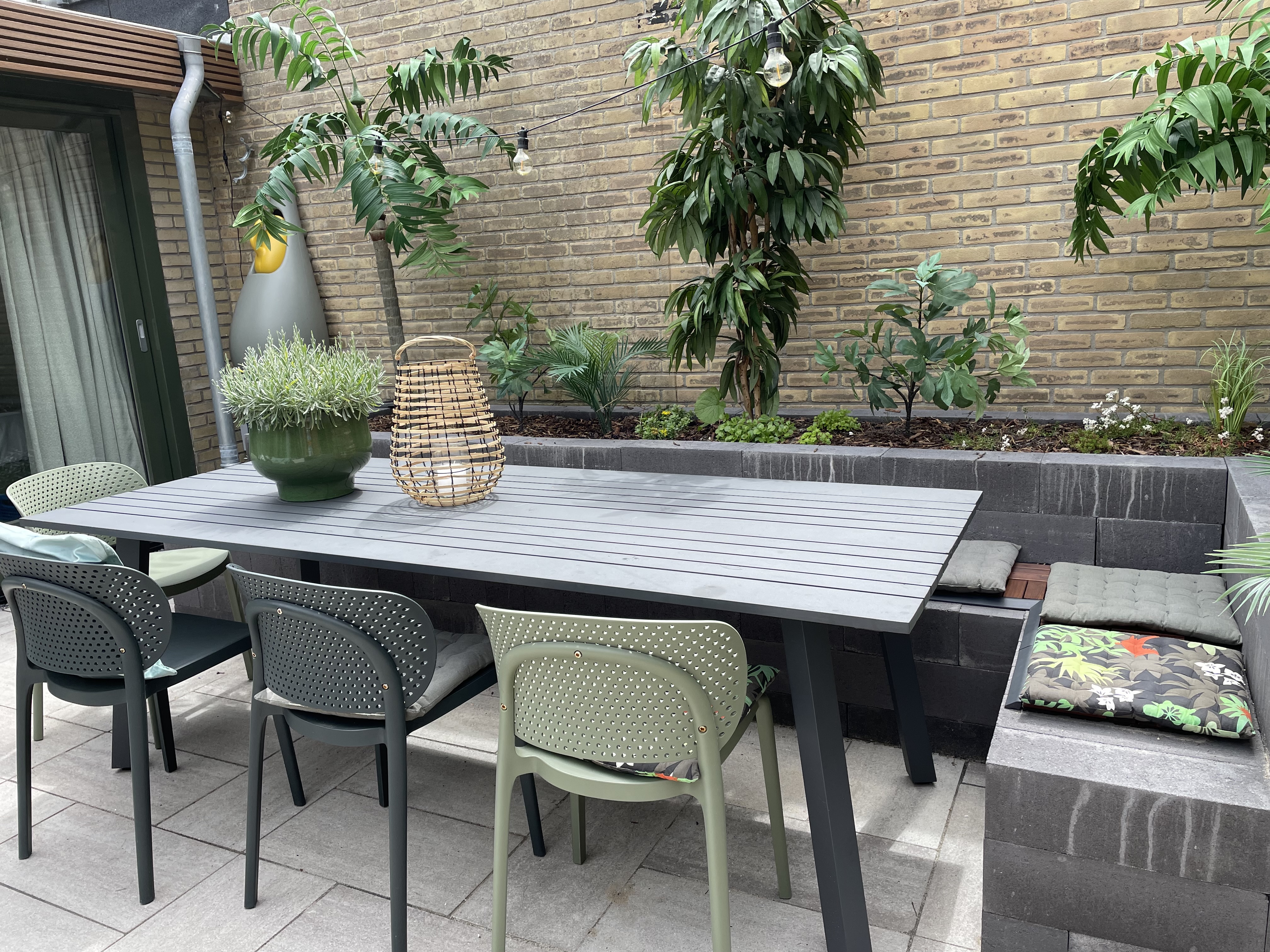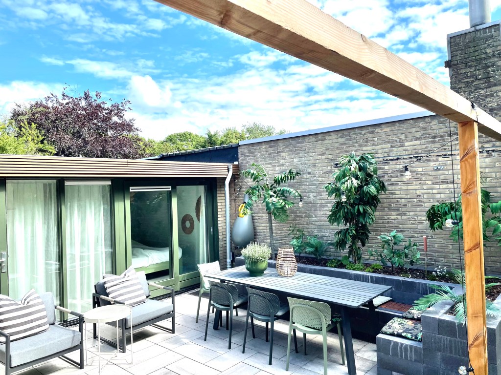De openslaande deuren in de living komen uit op de ruime, groene tuin. Door de dichtbegroeide omheining rondom de tuin heb je lekker veel privacy. De tuin ligt lekker diep en kent diverse plekken om in de schaduw of juist in de zon te liggen. Genieten van de ochtendzon met een bak koffie of een ontbijt? Pak dan lekker de kuipstoelen bij de entree. Daar schijnt de ochtendzon. Neem de kussens mee uit de woonkamer voor wat comfort. Nestel je lekker op de lounge stoel op het zonnige privé terras in de middag. De comfortabele grijze kussens zijn in de schuur te vinden. De eettafel is groot genoeg om nog wat mensen uit te nodigen. Maak het jezelf comfortabel en pak de kussens uit de woonkamer voor de stoelen. Zet 's avond de tuinlampen aan voor extra feestvreugde. Pak een dekentje uit de kast in de woonkamer om nog langer buiten te kunnen zitten.