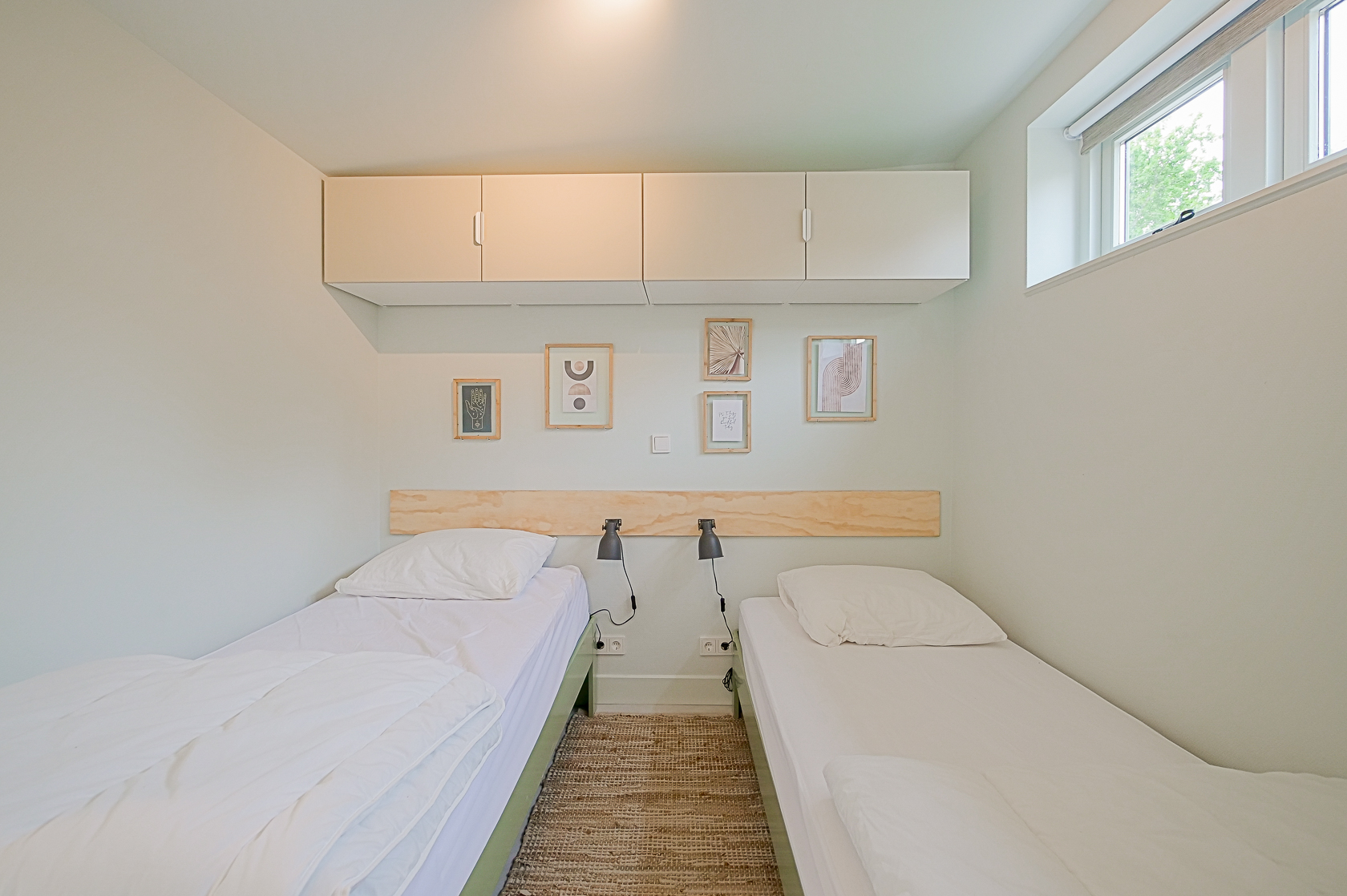 De tweede slaapkamer is lekker licht ingericht. Hier staan twee losse bedden. Ook hier Auping Auronde, een van 90x 210 cm. De andere is 90x200 cm. Ideaal is dit huis dus ook om met twee stellen lekker te cocoonen. Het hoofdbord van deze bedden kun je ook omhoog zetten. En lekker wat bovenkasten om je kleren achter te verstoppen. Zo blijft het lekker opgeruimd.